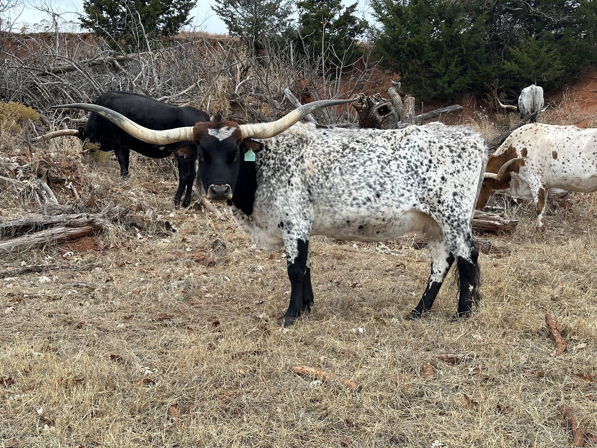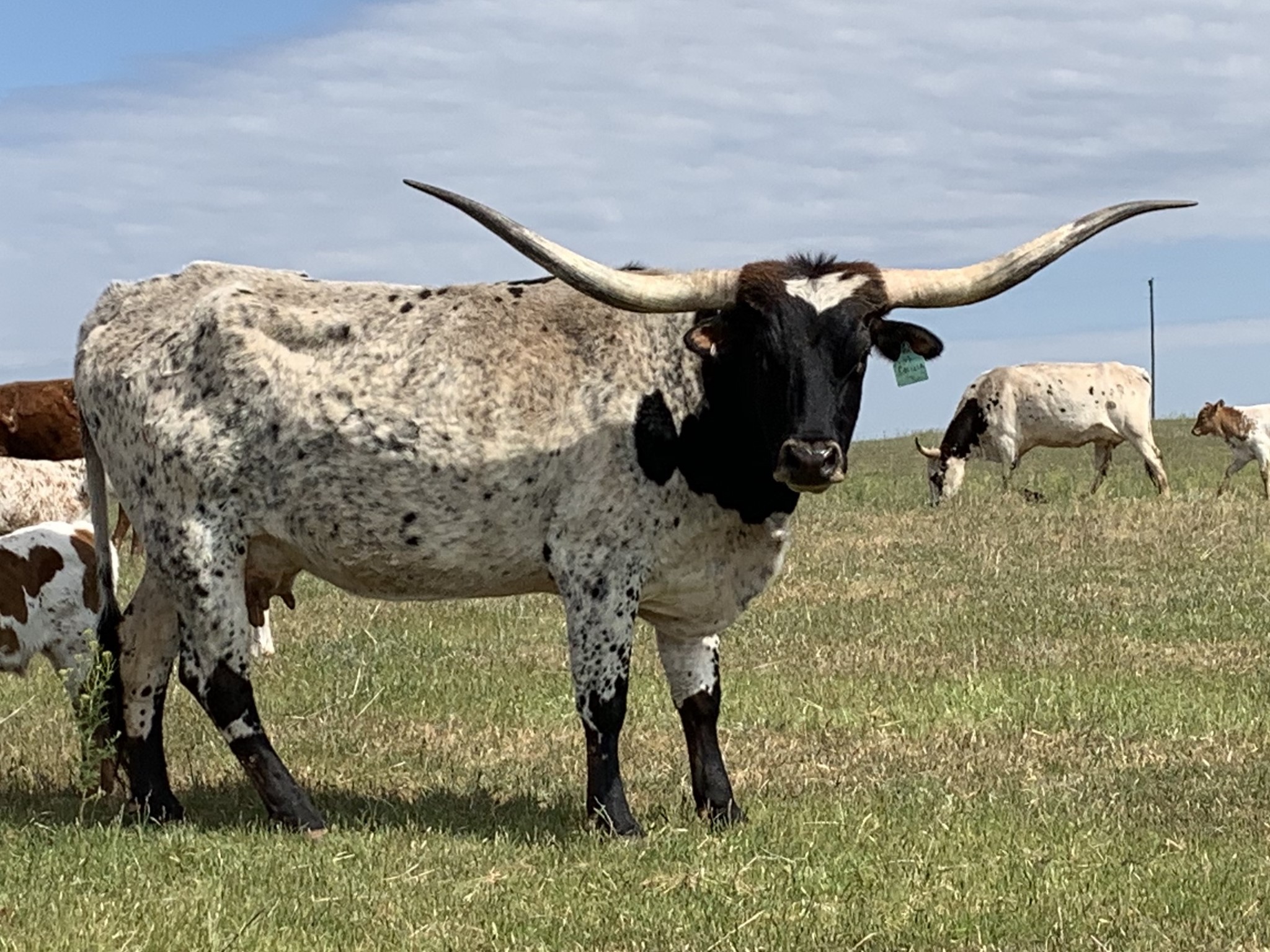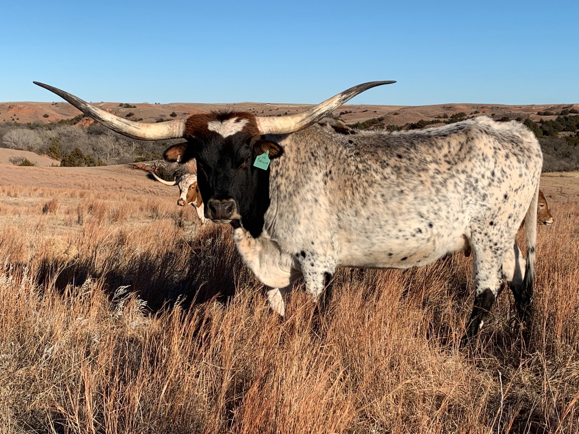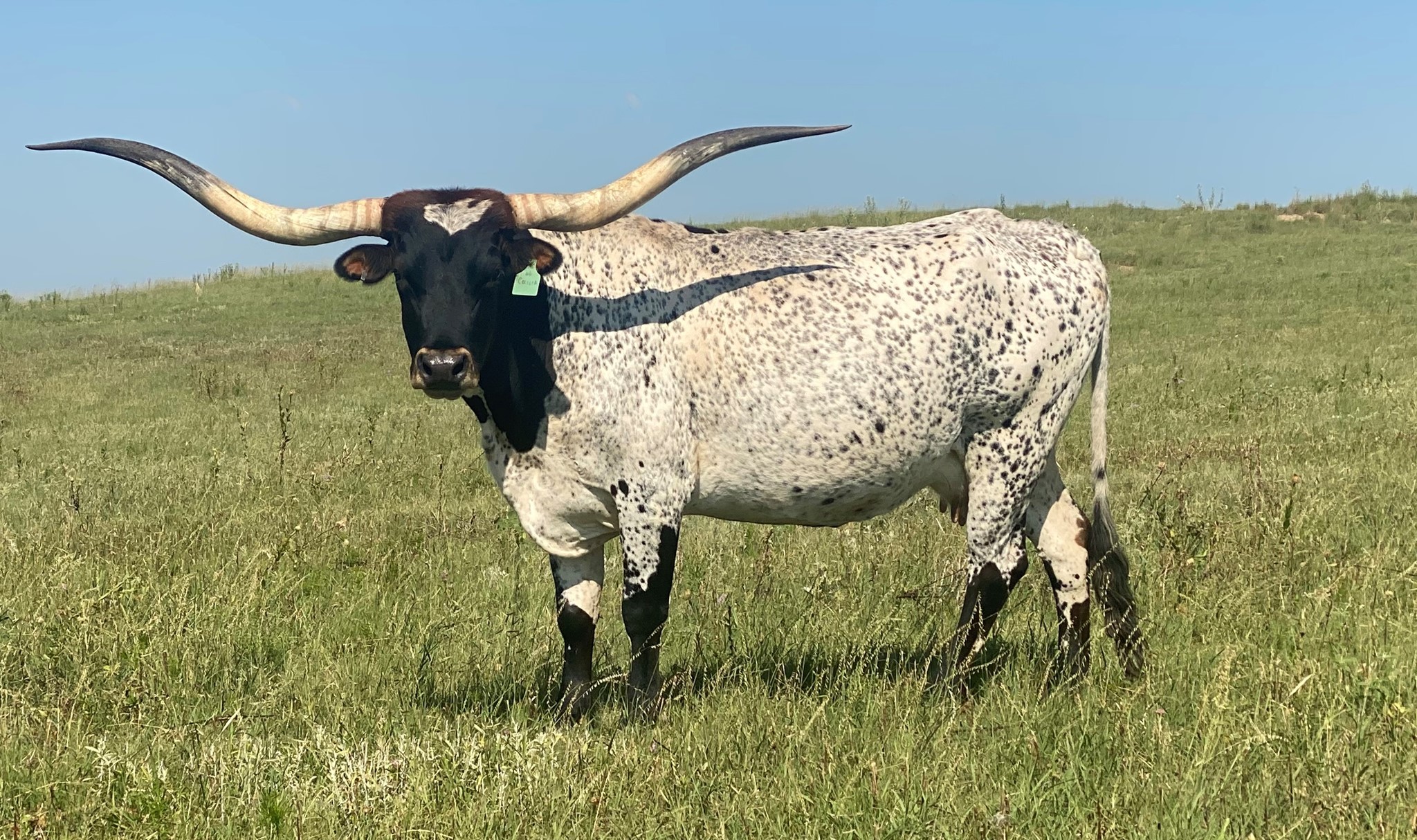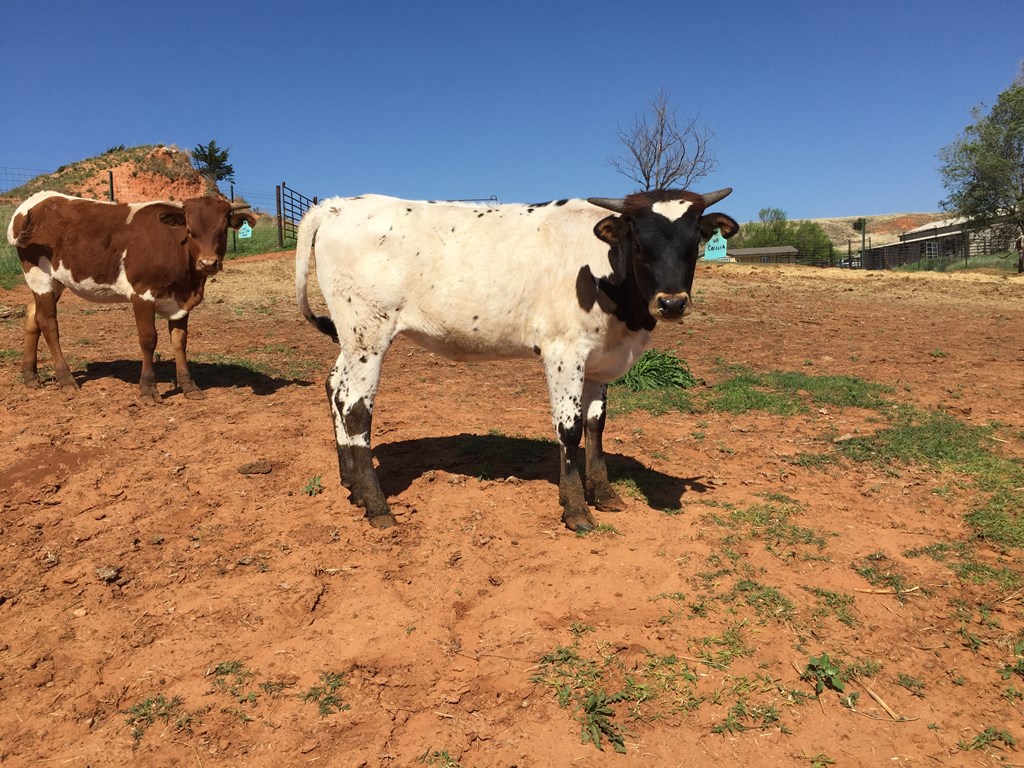 UPDATE!!!!!! Just measured OVER 90 inches!!! Super nice twisty daughter of White Dragon. She's been a great producer for us. Big soggy cow with lots of color and very friendly. Easy to handle. Currently bred to 50 Amp (50/50 X Horseshoe J Innovate). Gave us an outstanding daughter from Rifleman and her 50 Amp heifer was sold to Brazil and is putting on the horn!